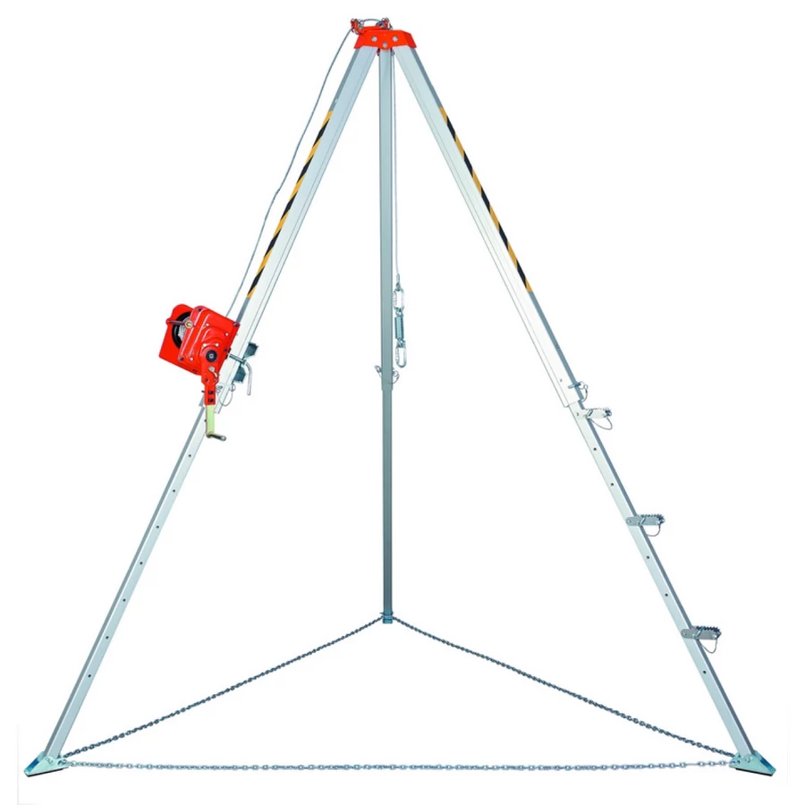 AT011 háromlábú, teleszkópos, hasáb profilú alumíniumállvány, rögzíthető talpakkal, 130 - 230 cm között állítható magasság, alapátmérő 165 - 235 cm, teherbírás 500 kg, súly 17,3 kg, rögzített felső kikötési pont lezuhanásgátlónak, statikus terhelhetősége 22 kN, lábakat stabilizáló, állítható fémlánc,